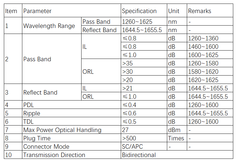 The FBG fiber grating reflector is a wavelength selective reflector, which is usually installed at the front end of the ONU of the optical network to achieve accurate and fast detection of the end-to-end attenuation of the optical link. Compared with thin-film reflectors, fiber grating reflectors have the following characteristics: