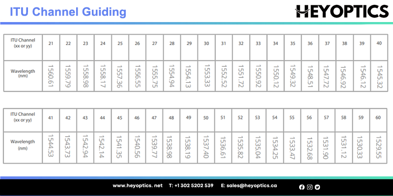 Generally speaking, the commonly used frequency bands of 100Ghz DWDM are C21~C60 (some will choose C20~C59). Take Heyoptics 40CH DWDM Mux Demux as an example, its wavelengths range is C21-C60. The wavelength band of the optical module can be matched with it. If there is no need to use all the 40 channels of the Mux Demux, it's better to choose optical modules from low bands, that is C21, C22, C23...