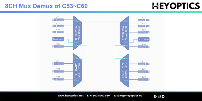 The common frequency bands of 16CH DWDM Mux Demux and 8CH DWDM Mux Demux are C21~C36 and C53~C60. Their transceiver selection is the same as the 40CH DWDM Mux Demux, just ordered from low band to high band. It is worth noting that C53~C60 can be connected with the 1530nm channel port in the CWDM system to realize the upgrade of the DWDM service on the CWDM system.