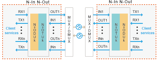 N into N out: N * low-speed client-side services to N * optical signals carried over ITU-T–compliant WDM wavelengths.