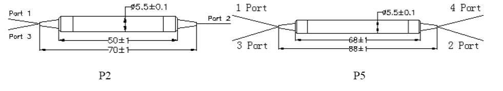 Package Dimensions (mm) For bare fiber of 900um loose tube φ5.5×L50(P2) φ5.5×L68(P5) φ5.5×L64(P8)